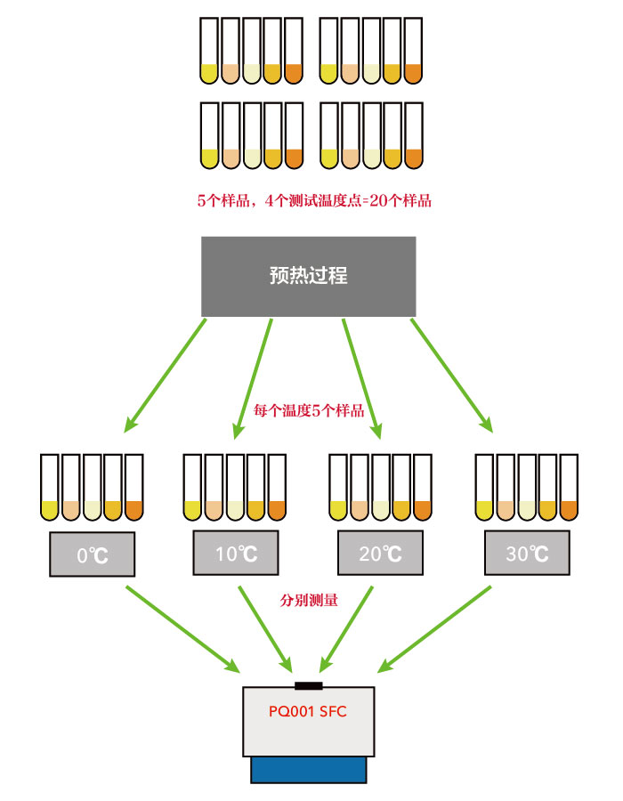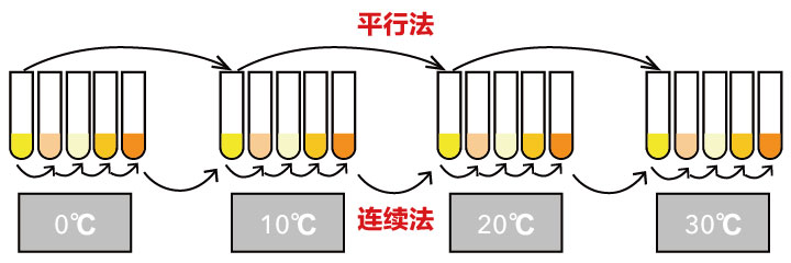 這個方法就是為每一個測試溫度準備一個水浴,然后準備不同批的樣品放置在不同的溫度的水浴中,即每一個樣品針對幾個不同的溫度必須準備幾個相同的樣品放置在不同的水浴中,第一個樣品的第一個溫度測定后、立即測定第一個樣品的第二個溫度、然后測定第一個樣品的第三個溫度,待第一個樣品測試結束后,再開始測定第二個樣品的第一個溫度……依此類推。