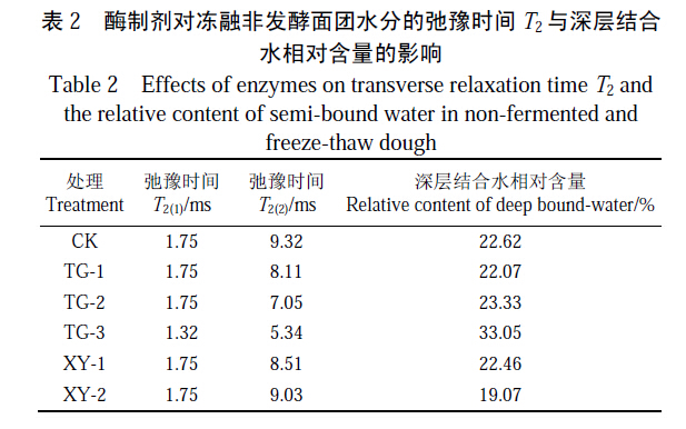 酶制劑對凍融非發(fā)酵面團水分的弛豫時間T2 與深層結(jié)合水相對含量的影響