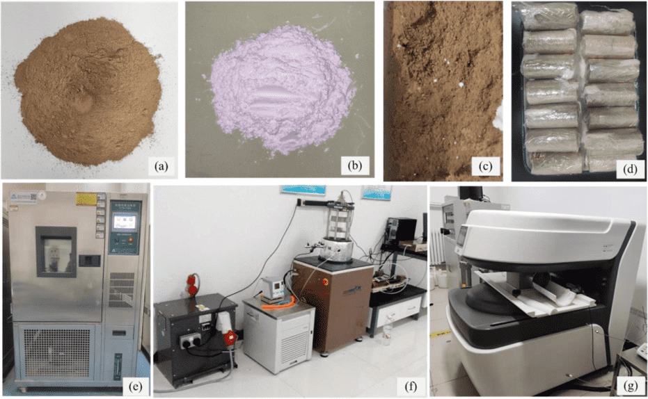 圖1 (a)黃土、(b)納米氧化鎂、(c)NM處理的黃土、(d)測試樣品、(e)凍融室、(f)動態(tài)三軸裝置、(g)核磁共振(NMR)分析儀。