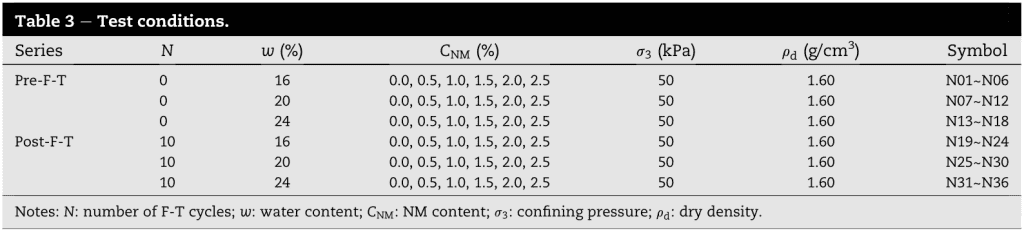樣品制備、動態(tài)三軸試驗(yàn)和核磁共振試驗(yàn)是在中國西安某重點(diǎn)實(shí)驗(yàn)室進(jìn)行的。干燥后的黃土首先被研磨并通過2毫米的篩子,然后在110℃下與NM一起烘烤24小時(shí)。隨后,根據(jù)預(yù)先設(shè)計(jì)的混合比例,對它們進(jìn)行人工攪拌。同質(zhì)混合物依次壓實(shí)成一個(gè)圓柱形。對于每個(gè)樣品,干密度被控制在1.60g/cm3。之后,在20±2℃下將它們密封并固化28天。