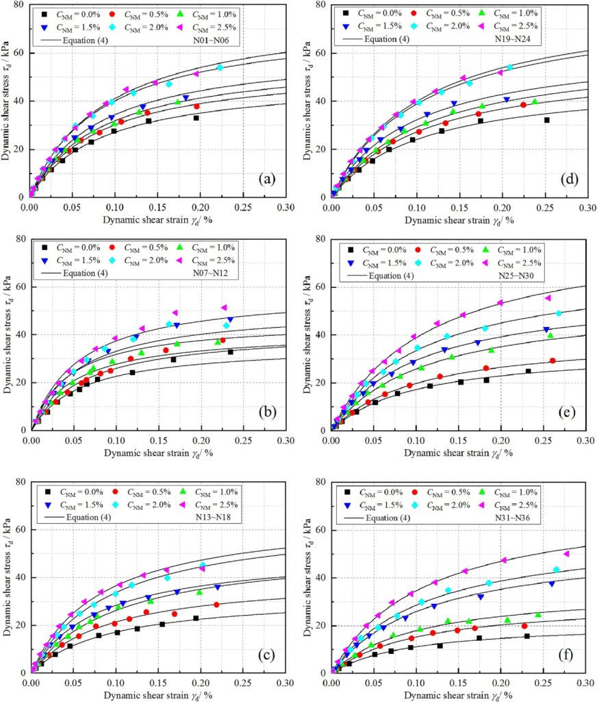 圖2顯示了NM含量為0%、0.5%、1.0%、1.5%、2.0%和2.5%時(shí),凍融前后樣本的動態(tài)剪切應(yīng)變-應(yīng)力曲線??偟膩碚f,所有的樣品都表現(xiàn)為應(yīng)變硬化特性,都遵循Hardin模型。此外,曲線隨著NM的增加而向上移動,這表明在相同的應(yīng)變水平下,較高的NM含量會導(dǎo)致較高的剪切應(yīng)力。