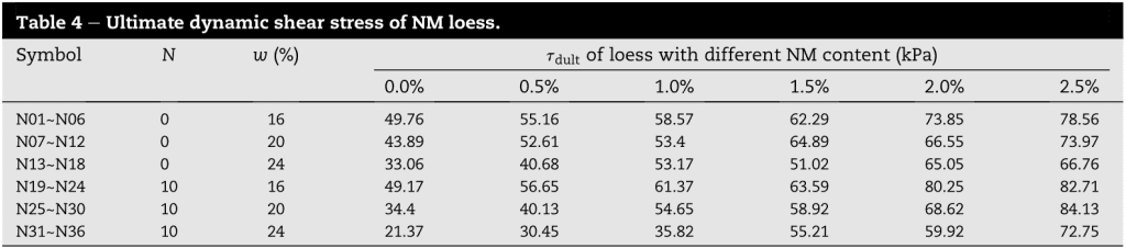 圖3描述了在各種評估條件下的動態(tài)剪切應(yīng)變-模量之間的關(guān)系。正如預(yù)期的那樣,隨著應(yīng)變的增加,剪切模量有一個(gè)下降的趨勢。先出現(xiàn)緩慢的降低,然后呈現(xiàn)出大幅下降。此外,我們觀察到,動態(tài)剪切應(yīng)變-模量曲線隨著NM的增加而向上移動,而隨著含水量的增加而向下移動,因此含水量對凍融的有害影響被揭示出來,同時(shí)證明了納米氧化鎂顆粒對黃土在凍融循環(huán)下抗性的提升作用。