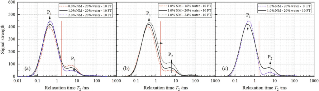 圖4顯示了在不同的試驗(yàn)條件下NM處理的黃土的弛豫時(shí)間分布。在該圖中,信號強(qiáng)度反映了樣品中的水含量,而T2與表面張力成反比,這與土壤中的水的狀態(tài)有關(guān)。對于重建的黃土,1.65毫秒處的紅色垂直線是對應(yīng)于結(jié)合水和自由水的截止點(diǎn),這意味著低于/高于1.65毫秒的信號分別反映了結(jié)合水/自由水。