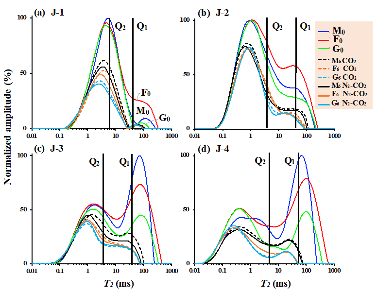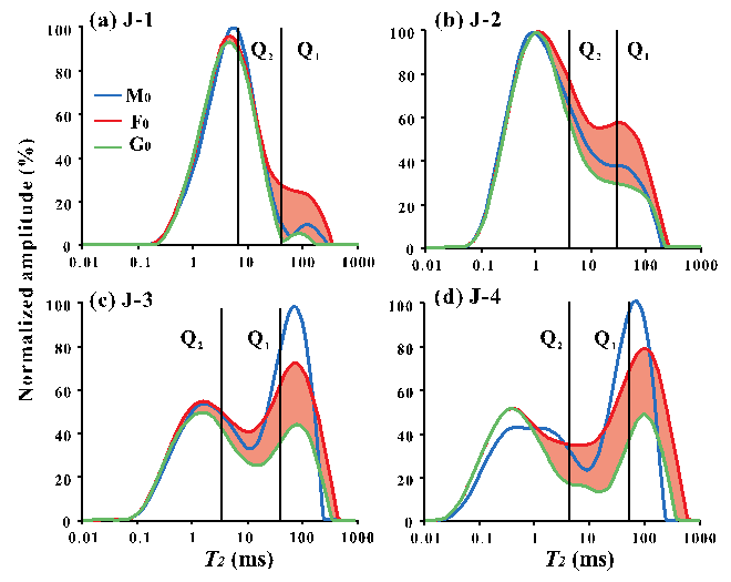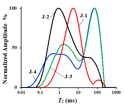 圖2. 壓裂前樣品飽和輕油T2譜(J-1和J-2取自吉木薩爾凹陷,J-3和J-4取自西湖凹陷)