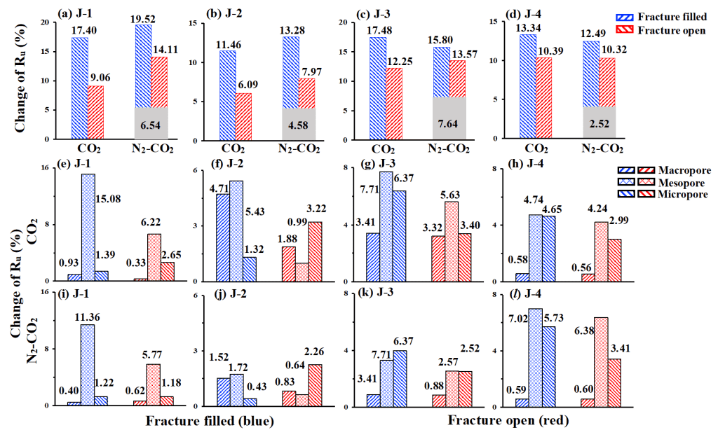 以壓裂前M0采收率為基值,對比裂縫和氣體組合下的增采量Ru(圖6)。基質(zhì)巖樣M0注N2-CO2效果要好于純CO2(灰色,Dong,2020a)。相比于純CO2吞吐模式,壓裂樣品注N2-CO2在微孔發(fā)育巖樣(J-1和J-2)中效果好,但在宏孔發(fā)育樣品中效果差(J-3和J-4),推測與N2分子對小孔的彈性支撐作用有關(guān)。裂縫會存儲大量氣體,尤其是CO2,削弱氣體在基質(zhì)孔隙的擴散動能,使得總采出量下降(紅色)。裂縫填充處理可以增大氣體在基質(zhì)孔隙中的波及效率,增大采收率(藍(lán)色)。短期來看,造裂會大幅度提高產(chǎn)量;但縫的儲氣性對長期開發(fā)會產(chǎn)生不利影響。