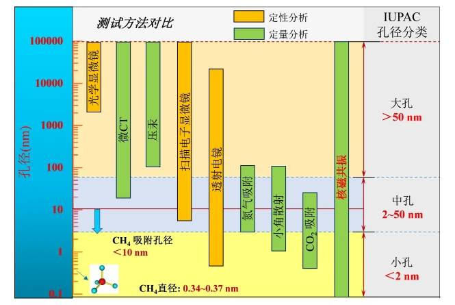 圖1 煤體孔隙特征測試方法適用范圍(nm)對(duì)比圖