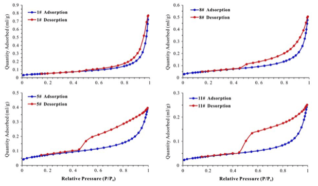 低溫氮氣吸附:砂礫巖氮氣吸附/解吸等溫線存在明顯的滯后環(huán),滯后環(huán)類型可以反映多孔介質(zhì)的孔隙形態(tài)。砂礫巖樣本的滯后環(huán)大致分為四種類型(見圖3):樣本1#、8#、5#和11#分別對應開縫孔、狹縫孔、墨水瓶孔和細頸寬體的墨水瓶孔。