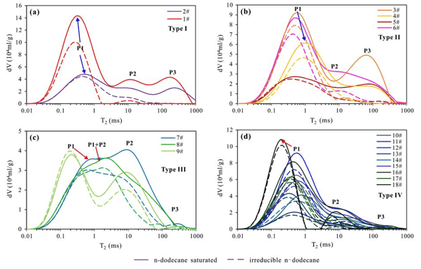 樣本在So狀態(tài)下的NMR T2 譜如圖5實線所示。T2譜整體呈三峰結構,存在四種類型:類型I有三個連續(xù)峰,P1峰zui高,P2與P3較為接近;類型II有明顯的P1和P3峰,P3峰左移;類型III有明顯的P1和P2峰或P1+P2峰;類型IV P1峰幅值zui高,P2和P3峰均較小。