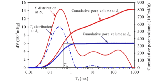 核磁共振((NMR)是一種快速、無損的測孔技術。它通過測試飽和含氫流體巖心的核磁共振T2譜,獲得巖石物性和流體賦存狀態(tài)信息(孔隙度、滲透率、孔徑分布、可動流體占比等)。而表征全尺度孔徑分布的關鍵是確定橫向弛豫時間T2與孔徑r之間的轉(zhuǎn)換系數(shù)C。