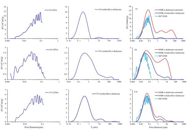 核磁共振 T2 譜:本文測試了樣本在三種狀態(tài)下的核磁共振 T2 譜:(1)洗油并110℃干燥后;(2)正十二烷飽和-So;(3)正十二烷離心-Soir。洗油干燥樣本的 T2 譜代表巖石顆粒表面的束縛水和粘土層間緊密結合的羥基水。So和Soir狀態(tài)下的 T2 譜需要減去干燥樣本的T2譜。