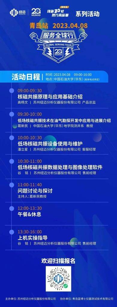 在這個春和景明,春林初盛的季節(jié),紐邁分析第四屆服務全球行2023年度活動即將開啟,4月8日(周六)與您相約中國石油大學(華東),青島站。