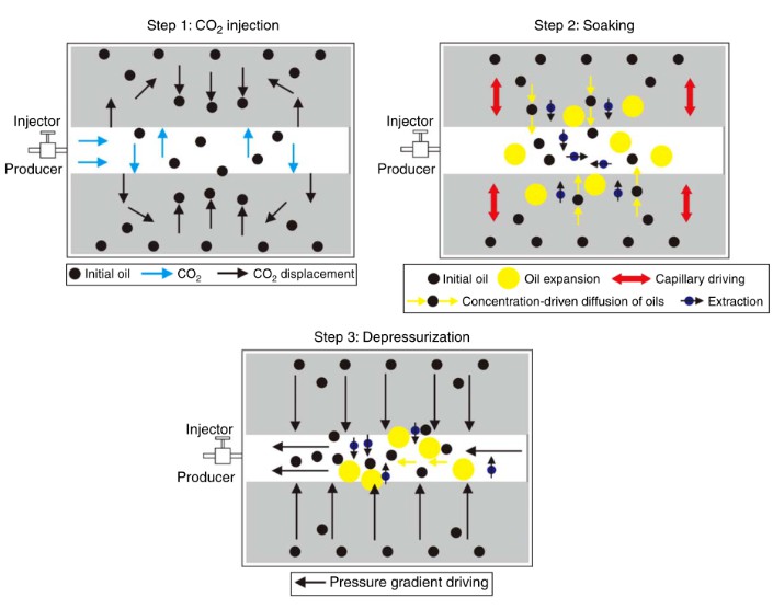 浸泡階段: 在此過程中注入的CO2進(jìn)一步擴(kuò)散到巖石基質(zhì)中,并溶解在基質(zhì)油中,此時(shí)以萃取作用和溶解作用為主,溶解的CO2導(dǎo)致局部高壓,從而將油驅(qū)向裂縫。