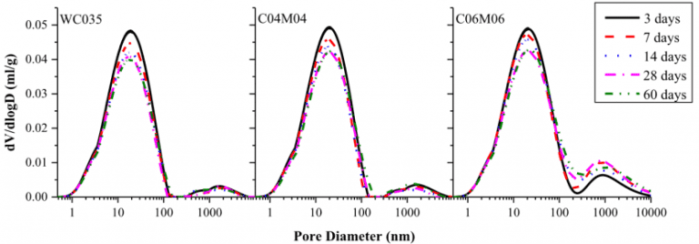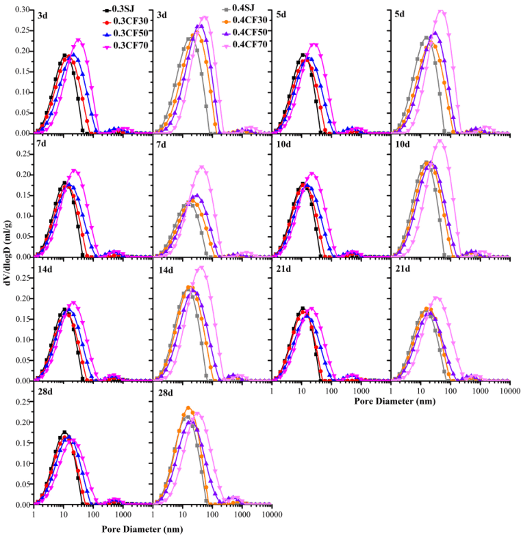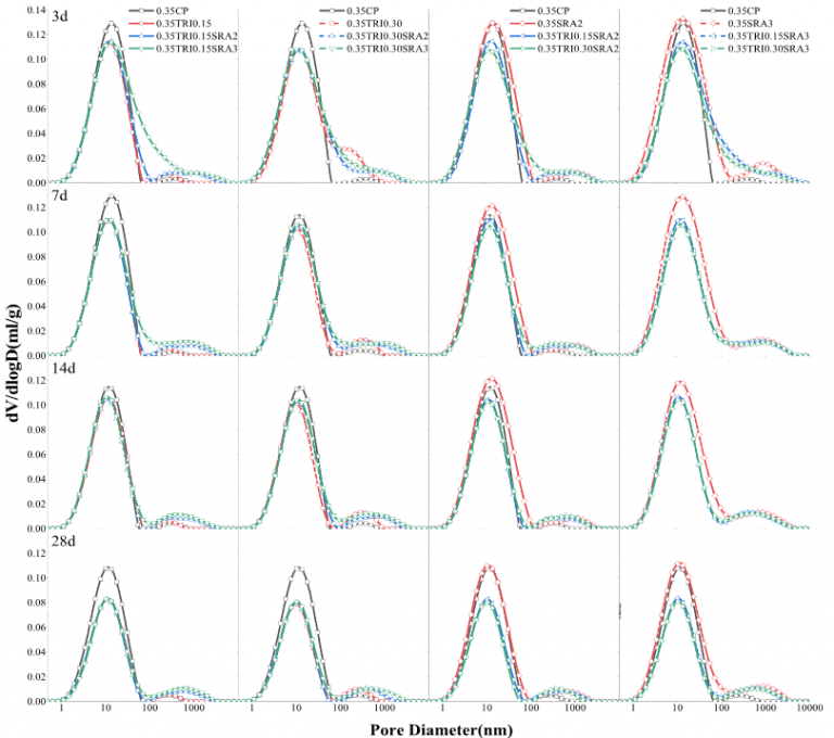 測試結(jié)果顯示,樣本的PSD通常包含兩個(gè)峰值。SRA和TRI的結(jié)合使用對樣本的PSD有明顯的影響??紫堵孰S著w/c和SRA含量的增加而變大,但隨著TRI含量的增加而下降。在28天內(nèi),同時(shí)添加SRA和TRI的樣品的孔隙率明顯低于沒有SRA和/或TRI的樣品[3]。