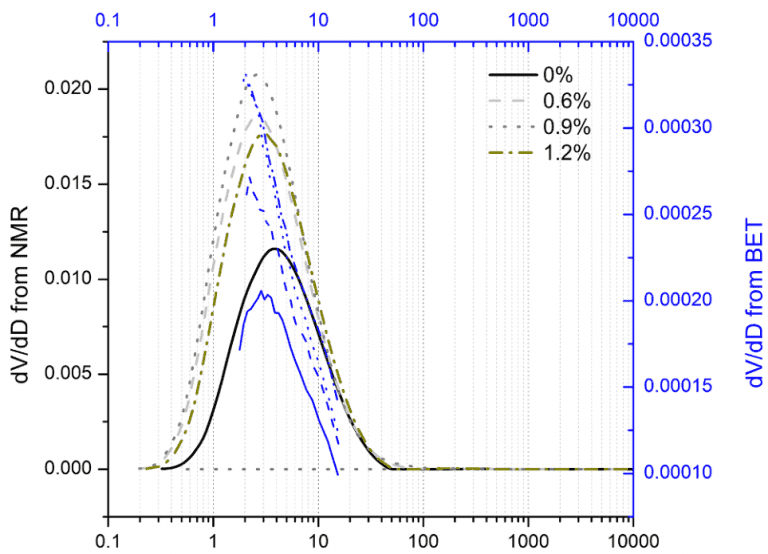 圖7 不同疏水劑含量的水泥基材料吸附法與核磁法的PSD分布