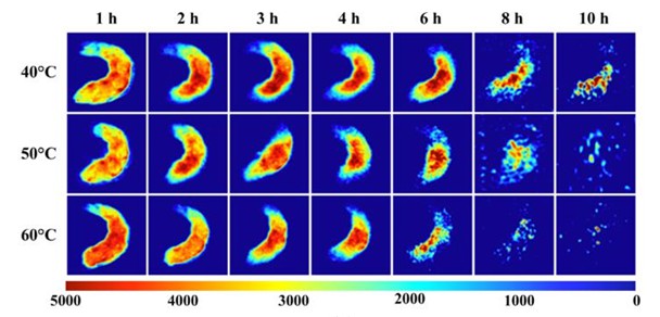 核磁共振成像已被證明是研究食品科學領域水分配的有效方法。下圖顯示了在40°C,50°C和60°C不同時間干燥的蝦的T2加權圖像的偽彩色圖像(低-高質子密度,藍紅色)。說明了具有流動性水的分布。隨著干燥時間的延長,較亮區(qū)域的大小顯示出持續(xù)減小的趨勢,這表明在干燥過程中失去了長弛豫信號。注意到隨著在三個溫度下干燥時間的增加,信號強度從外表面到內部區(qū)域減小。