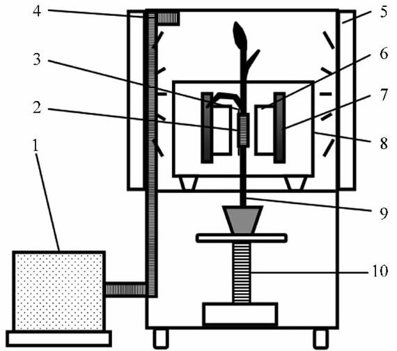 1.溫濕度控制箱 2.射頻探頭 3.外參管 4.風(fēng)管 5.燈箱6.永磁體 7.軛鐵 8.磁體保溫箱 9.小麥植株 10.升降臺