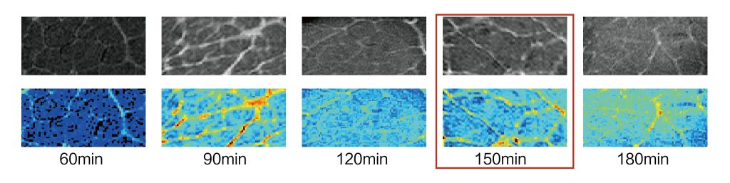 T1加權(quán)像中,網(wǎng)狀紋理是牛肉中脂肪,較暗的部分為牛肉中肌肉組織,隨著鹵制時(shí)間延長(zhǎng),脂肪溶解,網(wǎng)狀紋理變亮,隨后脂肪溶出,水分進(jìn)入,圖像整體變亮,網(wǎng)狀紋理消失。