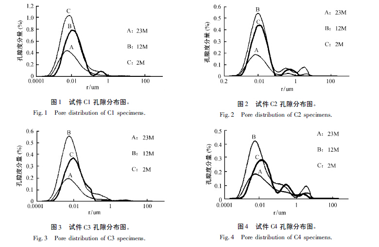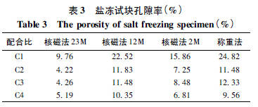 采用核磁共振方法,使用不同磁場強度分別測試了鹽凍試件( C1、C2、C3、C4 組配合比) 的孔隙率與孔隙分布情況。為對照測試結果,還采用了稱重法測孔隙率。