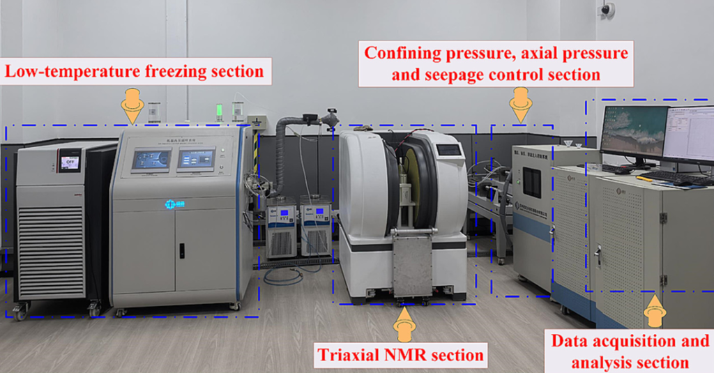 2)凍結(jié)-滲流耦合測試:設(shè)置圍壓為70 kPa,軸壓為100 kPa,模擬實(shí)際地層應(yīng)力。開啟低溫循環(huán),將凍結(jié)溫度設(shè)定為-30°C(梯度降溫),并施加0.5 ml/min的滲流邊界條件。在此過程中,系統(tǒng)持續(xù)采集T?譜和MRI圖像,以監(jiān)測水分遷移和滲流通道的演化。