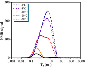 2)微孔主導(dǎo):剩余主峰代表微孔中的結(jié)合水,其比例隨溫度降低而增加。以黏土為例,在-1℃至-30℃的凍結(jié)過程中,微孔數(shù)量較室溫增加5.9%~6.0%。