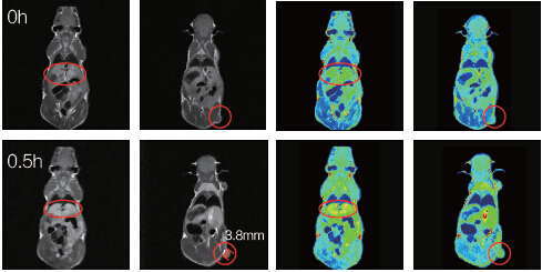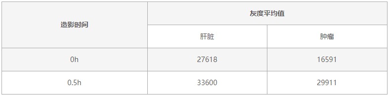 小鼠腫瘤直徑3.8mm;打入新型Mn螯合造影劑0.5h之后,通過(guò)灰度平均值計(jì)算,發(fā)現(xiàn)肝臟與腫瘤造影明顯。