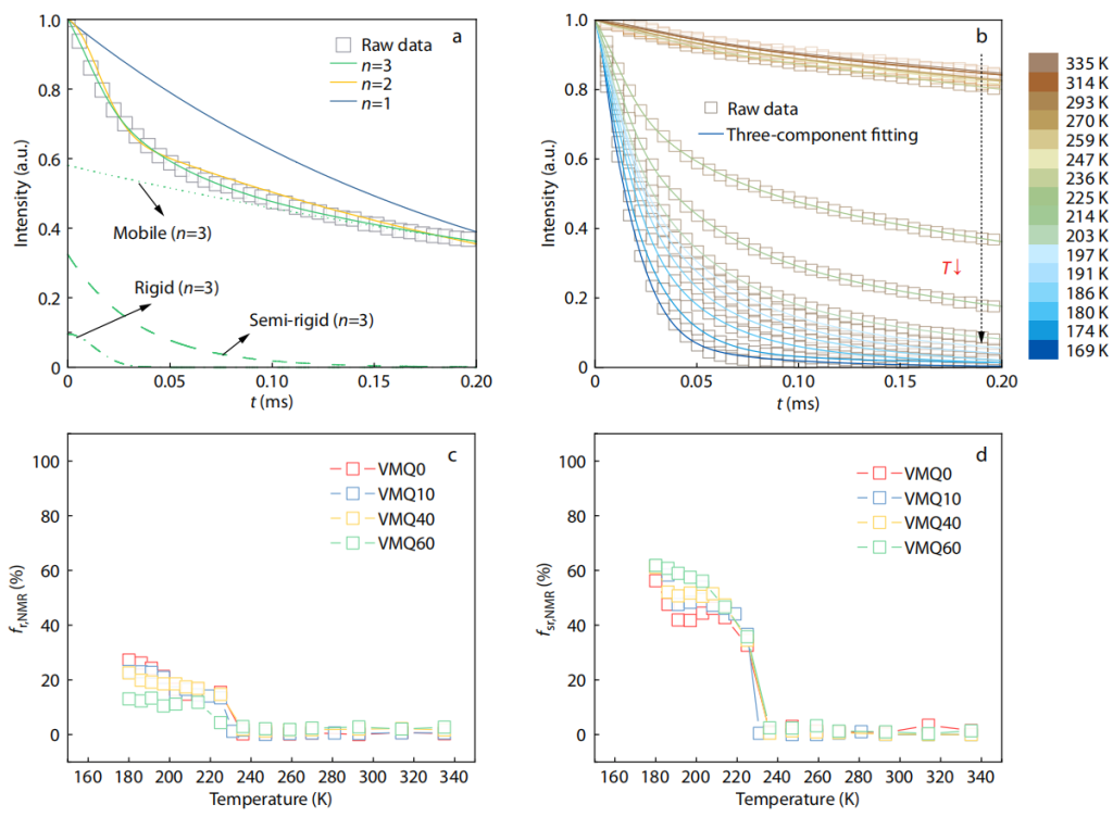 如圖c和d所示的擬合結(jié)果表明,VMQ/SiO2在Tm(熔點:228K)以下的剛性分數(shù)(fr,NMR)發(fā)生突變,且超過30%。在180 K的半剛性區(qū)域也觀察到了類似的趨勢,半剛性的組分差不多在60%。