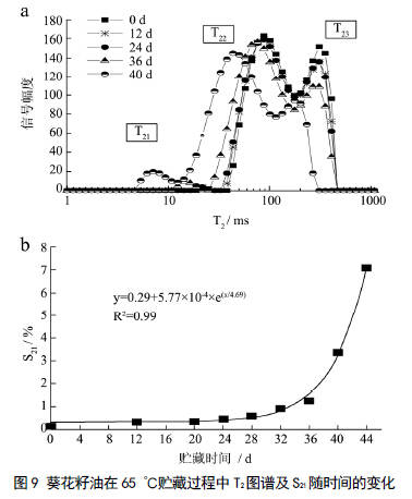 葵花籽油在65 ℃貯藏過程中低場(chǎng)核磁共振 檢測(cè)得到T2 圖譜如圖9a 所示,隨貯藏時(shí)間增加T2 整體有逐漸左移趨勢(shì),進(jìn)一步分析S21 的變化如圖9b 所示,葵花籽油的S21 隨貯藏時(shí)間呈良好的指數(shù)關(guān)系(R2=0.99)。這是由于,T2 特征峰一方面反映氧化產(chǎn)物中區(qū)別于甘油三酯成分的一類氧化產(chǎn)物的形成及積累,隨著貯藏時(shí)間的延長(zhǎng),具有類似T21 的化合物含量增加,從而使其低場(chǎng)核磁共振 的信號(hào)響應(yīng)增加,導(dǎo)致T2 圖譜中相應(yīng)的峰面積(S21)增加。