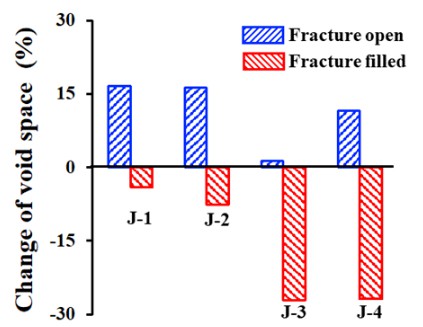 計算裂縫填充前后的孔隙變化率(圖4),PVF(藍色)反映壓裂對總孔隙的改善效果,PVG(紅色)反映基質孔隙轉化為裂縫的量。壓裂對微孔發(fā)育巖樣(J-1和J-2)孔隙體積的改善效果更明顯,但基質孔轉化為裂縫的比例低。宏孔發(fā)育巖樣(J-3和J-4)結論相反,總孔隙體積的改善效果一般,但基質孔轉化為裂縫的比例高。其中,PVF通過比較M0和F0累積核磁信號量得到,PVG通過比較M0和G0累積核磁信號量得到。