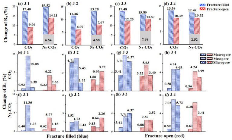 以壓裂前M0采收率為基值,對比裂縫和氣體組合下的增采量Ru(圖6)?;|巖樣M0注N2-CO2效果要好于純CO2(灰色,Dong,2020a)。相比于純CO2吞吐模式,壓裂樣品注N2-CO2在微孔發(fā)育巖樣(J-1和J-2)中效果好,但在宏孔發(fā)育樣品中效果差(J-3和J-4),推測與N2分子對小孔的彈性支撐作用有關。裂縫會存儲大量氣體,尤其是CO2,削弱氣體在基質孔隙的擴散動能,使得總采出量下降(紅色)。裂縫填充處理可以增大氣體在基質孔隙中的波及效率,增大采收率(藍色)。短期來看,造裂會大幅度提高產量;但縫的儲氣性對長期開發(fā)會產生不利影響。