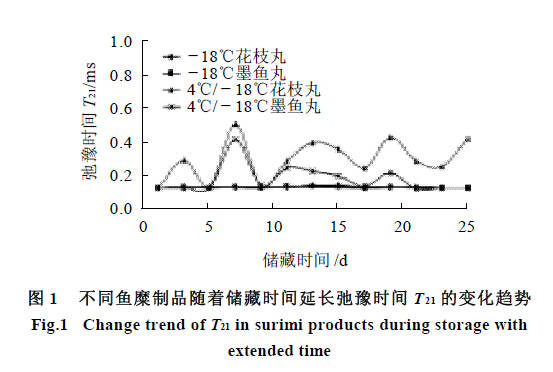 核磁共振技術(shù)是一種無損、快速的監(jiān)測手段,可從分子水平來研究魚糜制品儲藏過程的水分分布及其狀態(tài),直觀地顯示食品中水分及其遷移狀態(tài)。國外已將核磁共振技術(shù)應(yīng)用于食品加工與儲藏多方面。