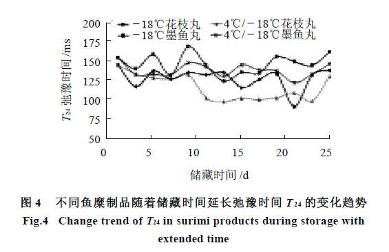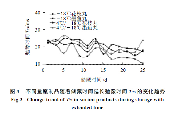這部分水與弛豫時(shí)間為T21 的水分特性相同,水的結(jié)合力都很強(qiáng),在魚糜制品中結(jié)合緊密。但T22 的結(jié)合力比T21 稍弱,這部分水與蛋白質(zhì)中的酰胺基、淀粉纖維素中的羥基形成較小的氫鍵。其結(jié)合強(qiáng)度比單分子層水要略差些