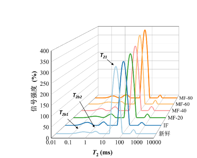 2、MF-60 處理組的 T21 值低于其他冷凍處理組,表明 MF-60 處理有效地抑制了固定水流動(dòng)性的增加,這可能歸因于 MF-60 抑制了大冰晶的形成,減少了冰晶對肌纖維網(wǎng)絡(luò)結(jié)構(gòu)的損傷,抑制了蛋白質(zhì)分子的展開和變性。