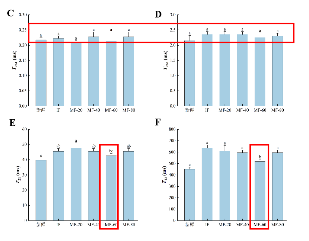 如圖所示,在0-1 毫秒(T2b1)、1-10毫秒(T2b2)、10-100毫秒(T21)和100-1000毫秒(T22)可以觀察到四種不同的水群體。T2b1和T2b2分別代表強(qiáng)結(jié)合水和弱結(jié)合水。T21 代表存在于肌原纖維蛋白致密網(wǎng)絡(luò)中的固定水,而T22代表存在于纖維束之間,依賴于毛細(xì)管力的自由水?。P2 代表相應(yīng)組的相對含水量,P2越大,重組組的相對含水量越高,反之亦然。(C-F)T2 代表樣品對水分子的結(jié)合能力,T2值越小,樣品對水分子的結(jié)合能力越強(qiáng),反之亦然。
