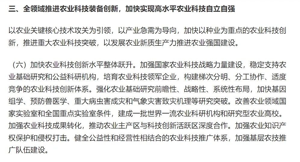 近日,中共中央、國務(wù)院印發(fā)的《加快建設(shè)農(nóng)業(yè)強(qiáng)國規(guī)劃(2024-2035 年)》在農(nóng)業(yè)領(lǐng)域引發(fā)廣泛關(guān)注。該規(guī)劃明確指出,要全領(lǐng)域推進(jìn)農(nóng)業(yè)科技裝備創(chuàng)新,將加快實(shí)現(xiàn)高水平農(nóng)業(yè)科技自立自強(qiáng)作為核心任務(wù)。