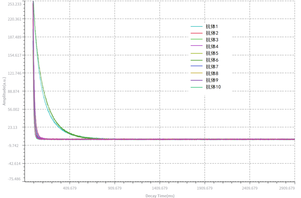 測(cè)試2批次十個(gè)mAb單抗樣品的T2弛豫時(shí)間,可以對(duì)樣品進(jìn)行快速的分類和篩選,并且可以明顯區(qū)分不同的抗體樣品。