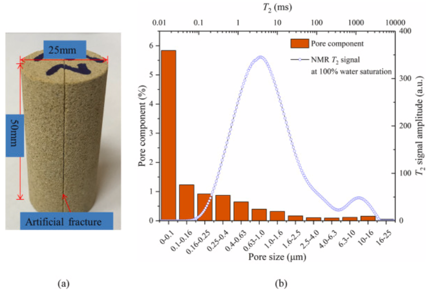 圖一左為巖樣,中間為人造裂縫,用于填充注漿材料,圖一右為核磁表征的孔徑分布。