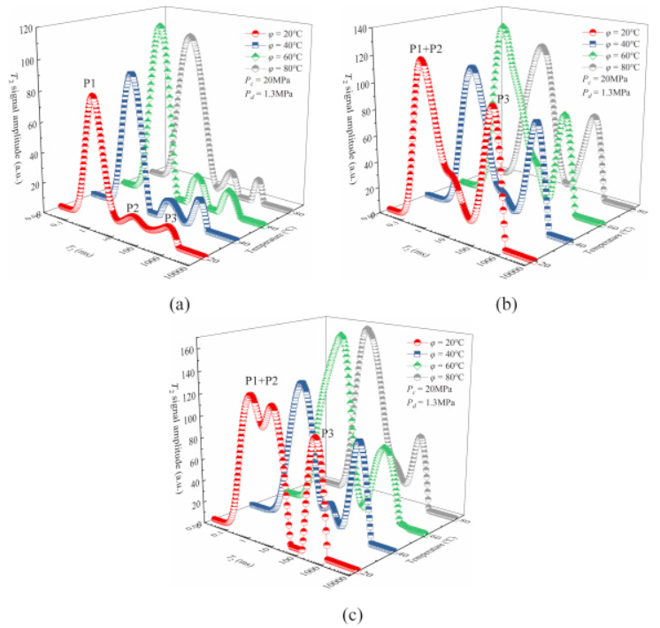 最初,不同溫度下砂巖弛豫分布呈三峰分布(圖三(a))。然后,隨著注漿的繼續(xù),T2分布逐漸變化(圖三(b)和(c))。隨著注入時間從t=30s增加到60s,第二峰幾乎與第一峰合并,T2弛豫分布從三峰分布轉換為雙峰分布(圖三(b)),其中新的第一峰(P1+P2)和第二峰(P3)分別分布在0.1ms–100ms和100ms–1000ms的范圍內。此外,隨著注入時間的增加,不同溫度下新的第一峰(P1+P2)和第二峰(P3)均增大,意味著漿體同時滲透到微孔、大孔和裂縫中。此外,隨著溫度從20℃升高到80 ℃,t= 30s處新的第二峰(P3)面積減小,這代表了溫度升高對裂縫中漿體的流動有明顯阻礙作用。如圖三(c)所示,隨著進樣時間從t=30s增加到60s,新的第二峰(P3)變化不大,而新的第一峰(P1+P2)的面積和峰值明顯增加。這意味著此時的滲流過程主要發(fā)生在巖石孔隙中,漿體從裂縫滲透到微孔隙中。