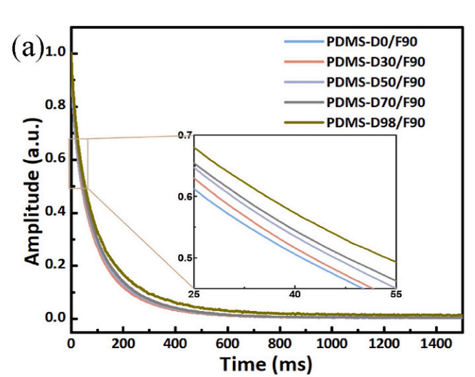 該課題組提出了一種通過在聚合物網(wǎng)絡(luò)中引入懸掛鏈的解決策略,制備了具有高熱導(dǎo)率(4.50 W/m?k)和優(yōu)異柔韌性的TIMs(伸長率104%,楊氏模量0.24 MPa)。低場核磁測試在該應(yīng)用中發(fā)揮了重要作用。