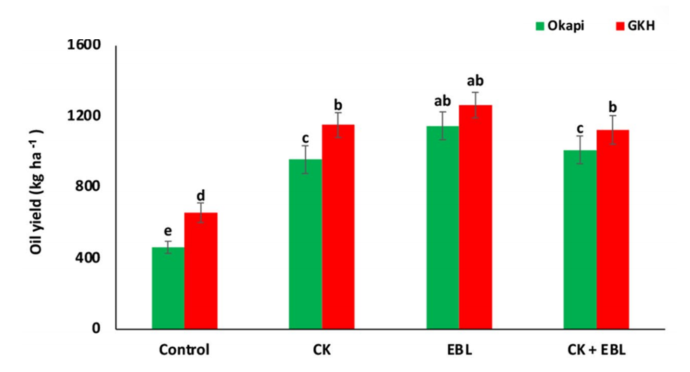 在相同處理和灌溉水平下,GKH 品種的油產(chǎn)量整體高于 Okapi 品種。這體現(xiàn)了不同油菜品種在產(chǎn)量潛力上存在差異,GKH 品種可能具有更好的生長特性或?qū)に靥幚淼捻憫?yīng)機(jī)制,使其在油產(chǎn)量上表現(xiàn)更優(yōu) 。