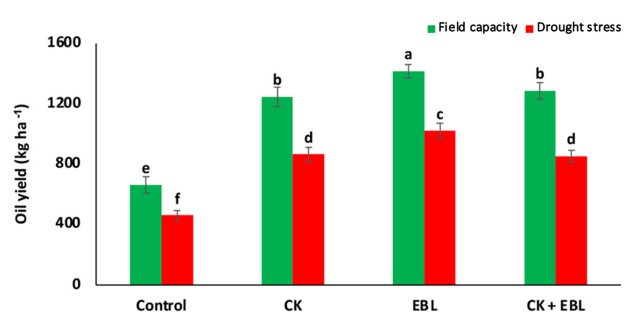 激素葉面噴施的作用:在兩種灌溉水平下,葉面噴施 CK、EBL 和 CK+EBL 均能顯著提高油菜的油產(chǎn)量。其中,EBL 處理的效果最為顯著,在田間持水量和干旱脅迫下,EBL 處理的油菜油產(chǎn)量相比對(duì)照均有大幅度增加,說明 EBL 對(duì)提高油菜油產(chǎn)量有積極作用。在干旱脅迫下,EBL 處理后的油菜油產(chǎn)量下降幅度相對(duì)其他處理較小,這進(jìn)一步表明 EBL 在緩解干旱脅迫對(duì)油菜油產(chǎn)量的負(fù)面影響方面效果突出。