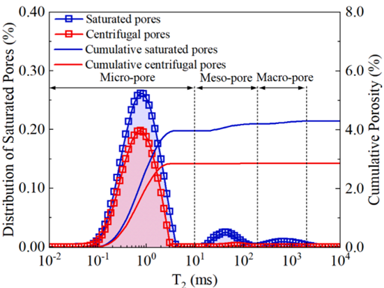 該研究使用低場核磁共振技術,研究了脈沖加載水力壓裂后損傷煤樣的孔隙結構,獲取弛豫譜圖和孔隙度分布信息,有以下結論:圖二表明煤的孔隙度分布隨T2的變化而變化。根據飽和孔隙的累積曲線,微孔的孔隙率約為3.96%,總孔隙率為4.30%。煤樣的峰值飽和孔隙度位于T2=0.76ms處。飽和孔隙率包括被游離水和吸附水占據的孔隙。通常可用通過離心法去除游離水來測量吸附的孔隙率。飽和孔隙和離心孔隙的覆蓋面積之差代表自由孔隙。從累積孔隙率曲線可以看出,吸附孔隙的孔隙率為2.86%,自由孔隙的孔隙率為1.44%。