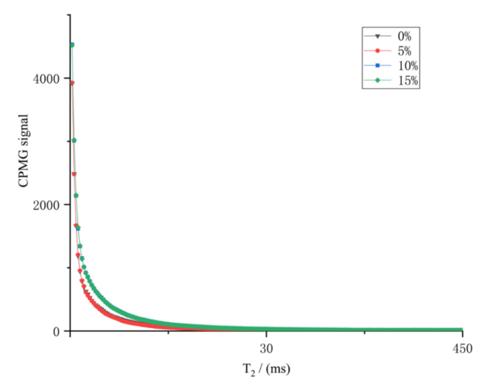 在本應(yīng)用中,應(yīng)用了紐邁公司生產(chǎn)的VTMR20-010V-T型號低場核磁設(shè)備,利用CPMG序列獲取了HTPB涂層在不同應(yīng)變下(將HTPB涂層試樣固定在夾具上,分別拉伸至四個恒定應(yīng)變水平,分別為0%、5%、10%和15%)的橫向弛豫衰減曲線。將橫向弛豫衰減分為兩部分:快速衰減和慢速衰減,并通過XLD方法計算了交聯(lián)密度。分析了不同應(yīng)變下HTPB涂層的橫向弛豫特性及其微觀結(jié)構(gòu)的變化。