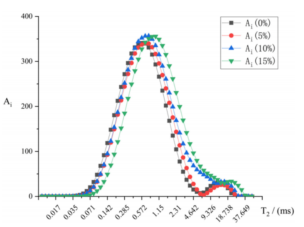 圖二展示了不同應(yīng)變條件下的衰減曲線。隨著應(yīng)變的增大,曲線的衰減幅度逐漸減小,這表明應(yīng)變越大,材料的交聯(lián)密度越小,這與圖二中交聯(lián)密度的測試結(jié)果一致。然而,曲線只能定性地顯示HTPB涂層交聯(lián)結(jié)構(gòu)的變化趨勢。為了定量描述橫向弛豫特性,通過進(jìn)一步處理,得到了T2弛豫的反演曲線,如圖三所示。隨著應(yīng)變的增加,反演曲線有向右移動的趨勢??焖贆M向弛豫時間從0.572毫秒增加到1.000毫秒,慢速橫向弛豫時間從12.328毫秒增加到21.544毫秒,T2的總峰面積從5889.298增加到6615.835。這種現(xiàn)象的主要原因是應(yīng)變效應(yīng)導(dǎo)致鏈段之間的距離增加。分子鏈從卷曲狀態(tài)展開,分子鏈重新排列,因此在力的方向上有更多的取向選擇,橫向弛豫的衰減幅度減慢。