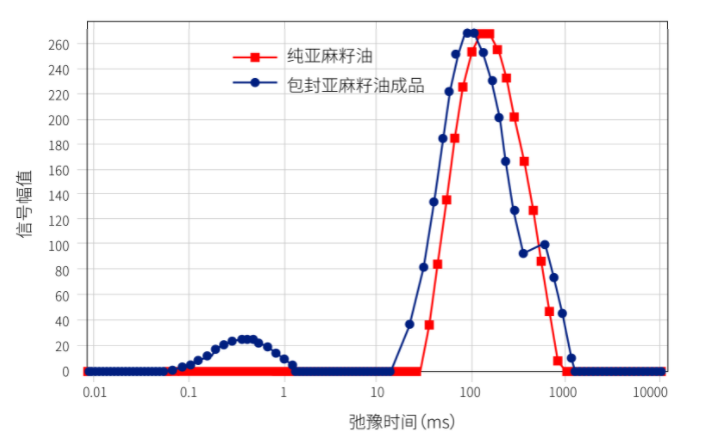 一份包封后的亞麻籽油成品,以及一份原料亞麻籽油(由蘇州本地一家實(shí)驗(yàn)室購買,確保包封的亞麻籽油與原料亞麻籽油是同一批次)。通過低場核磁共振設(shè)備檢測,其弛豫時(shí)間相關(guān)譜如下: