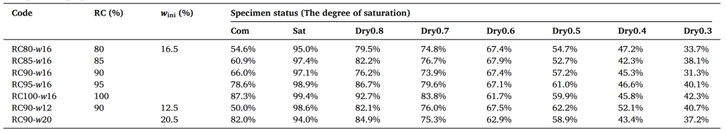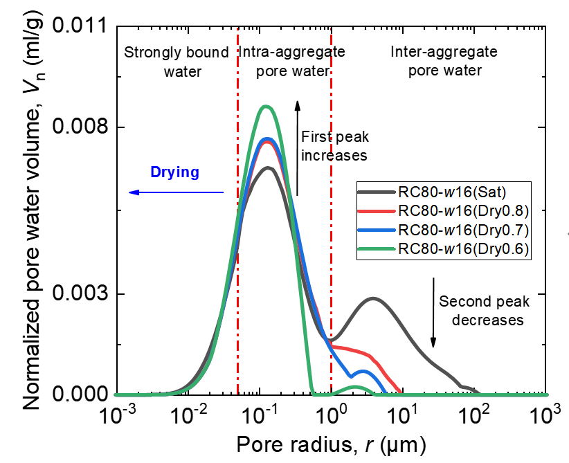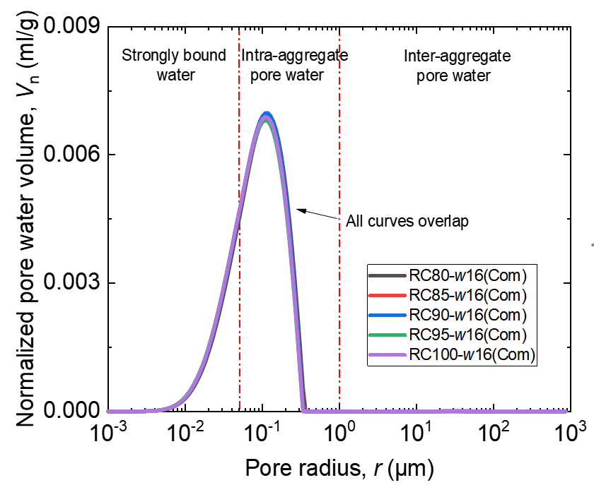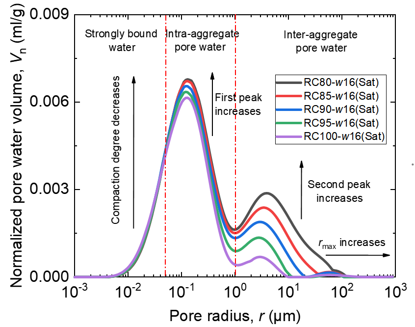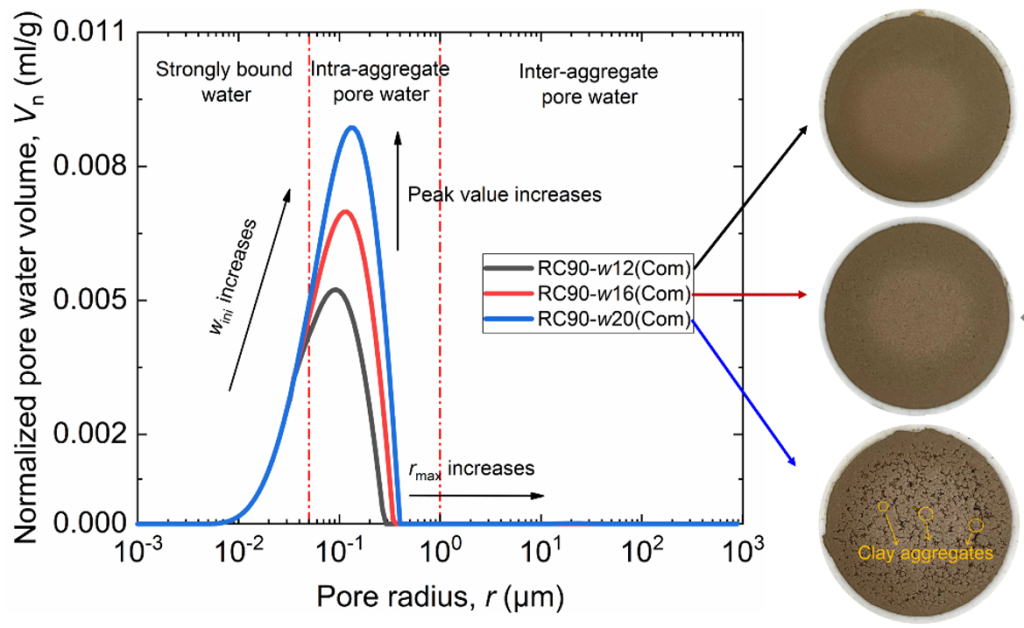 和大于1.0μm。壓實(shí)度和初始含水率對(duì)土體孔隙水分布的影響表現(xiàn)出明顯差異。對(duì)于非飽和壓實(shí)試樣,孔隙水分布基本不受壓實(shí)度變化的影響,而初始含水率的增加會(huì)促進(jìn)黏土集聚體的形成,從而增大最大持水孔隙半徑并提高集聚體內(nèi)孔隙水含量。對(duì)于飽和壓實(shí)試樣,隨著壓實(shí)度的降低,集聚體間和集聚體內(nèi)孔隙水含量均有所增加;同時(shí),隨著初始含水率的提高,孔隙水分布形態(tài)由單峰型逐漸轉(zhuǎn)變?yōu)殡p峰型。在土體干燥過程中,集聚體間孔隙水迅速排出,集聚體內(nèi)主導(dǎo)孔隙水含量先增加后減少,而強(qiáng)吸附水含量始終保持不變。基于Young–Laplace理論,可以建立累積孔隙水分布曲線與土–水特征曲線(SWCC)之間的系。利用土體干燥過程中累積孔隙水分布曲線的包絡(luò)線,可對(duì)SWCC進(jìn)行較為準(zhǔn)確的預(yù)測(cè)。