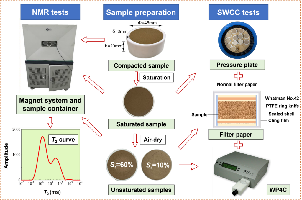 土體的孔隙水分布是指孔徑與其對(duì)應(yīng)的孔隙水含量之間的定量關(guān)系,它控制著土體的水力和力學(xué)行為,如抗剪強(qiáng)度、滲透性、壓縮性和持水能力等。當(dāng)前用于測(cè)量土體孔隙結(jié)構(gòu)的方法較多,如壓汞法(MIP)、掃描電子顯微鏡(SEM)以及X射線掃描等,但能夠直接測(cè)量土體孔隙水分布的技術(shù)手段仍然十分有限。例如,對(duì)于非飽和土試樣,并非所有孔隙都充滿水,而MIP技術(shù)測(cè)量的是土體中所有孔隙(包括充水孔隙、非飽和孔隙及干孔隙),因此難以反映真實(shí)的孔隙水分布特征。相比傳統(tǒng)試驗(yàn)方法在刻畫土體孔隙水分布方面的不足,核磁共振(NMR)技術(shù)為此提供了一種良好的解決方案。鑒于NMR技術(shù)能夠捕捉存儲(chǔ)于不同孔徑中的孔隙水,其非常適用于揭示土體孔隙水遷移與重分布的微觀機(jī)制。在非飽和土力學(xué)研究方面,一些學(xué)者利用NMR技術(shù)測(cè)試了土體的T2曲線,但其討論主要局限于宏觀含水量的變化,未進(jìn)一步分析不同孔隙中的水分分布特征,且未明確區(qū)分孔隙水的具體形態(tài)與類型。