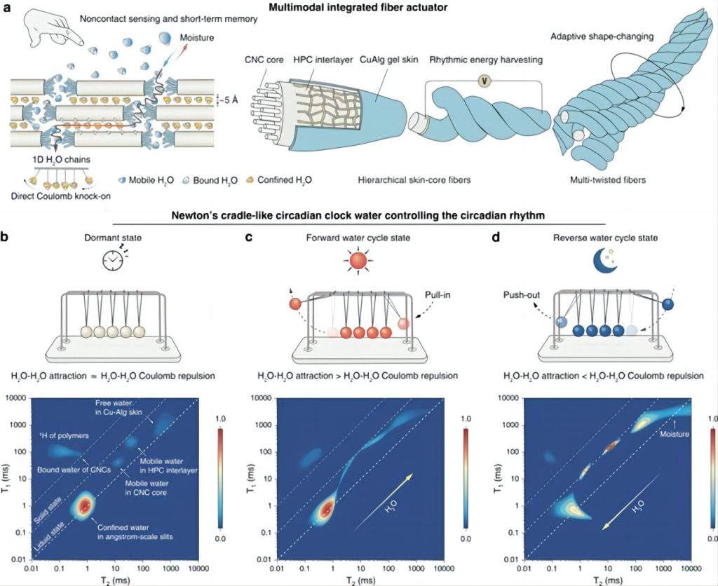 在由CNCs形成的埃尺度限域狹縫中,水通過直接庫侖撞擊進(jìn)行傳輸,類似于牛頓擺運(yùn)動。與無序水?dāng)U散相比,這種集體運(yùn)動模式對纖維內(nèi)水的變化表現(xiàn)出更高的敏感性。這種類似于牛頓擺的集體水運(yùn)動結(jié)合界面融合實(shí)現(xiàn)了跨層高效水傳輸,在纖維內(nèi)形成了一個高度敏感的負(fù)反饋回路。其中,CNCs芯層內(nèi)限域水活度極低,但移動性為T1/T2 = 1.02,接近理想值(T1/T2= 1)。近乎理想的限域水就像一個主時鐘一樣控制著加捻纖維的晝夜節(jié)律行為。當(dāng)環(huán)境中含水量與限域水相匹配時,兩者停止交換,此時纖維進(jìn)入休眠狀態(tài)。當(dāng)環(huán)境含水量低于限域水時,纖維呈正向循環(huán)狀態(tài),限域水開始向周圍環(huán)境輸送。當(dāng)環(huán)境含水量超過限域水時,纖維進(jìn)入反向水循環(huán)狀態(tài),環(huán)境中的水被輸送到纖維中。限域水的自旋布居形狀證實(shí)了這三種不同的交換模式。