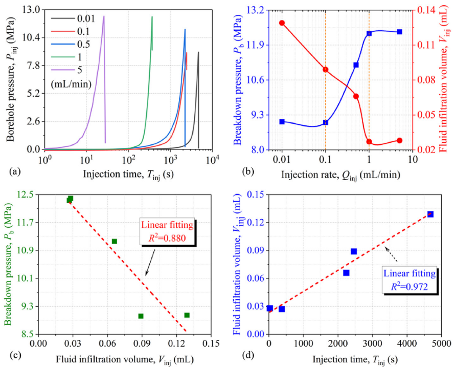 Pb與Vinj呈強(qiáng)負(fù)相關(guān)(Pb = -1.05Vinj+ 42.3,R2=0.880),證明實(shí)際滲入流體量(非注入速率)主導(dǎo)破裂行為。