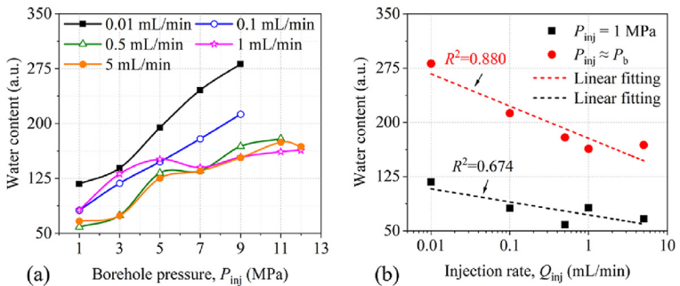 隨井筒壓力P上升,水含量線性增長(zhǎng),但不同Qinj下斜率差異顯著: