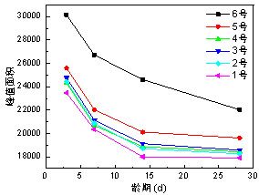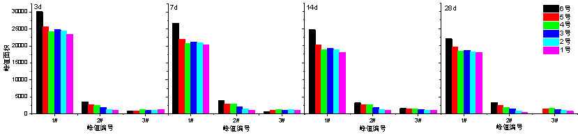 作者利用核磁共振技術(shù)對(duì)不同齡期的膠砂試件進(jìn)行測(cè)試,其T2弛豫結(jié)果如圖4所示,T2弛豫譜圖顯示出三個(gè)明顯的峰值,分別代表不同相態(tài)的水分。根據(jù)核磁共振原理,峰值頂點(diǎn)對(duì)應(yīng)的弛豫時(shí)間T2表征水分子的運(yùn)動(dòng)性,峰頂點(diǎn)T2越大,則表示該相態(tài)水的運(yùn)動(dòng)性越強(qiáng),被束縛程度越弱;峰值面積表征該相態(tài)水的相對(duì)量大小,峰面積越大,則該相態(tài)水含量越多;峰值比例表征該相態(tài)水含量占樣品中總水分的比例,峰比例越大,則該相態(tài)水占比越多。